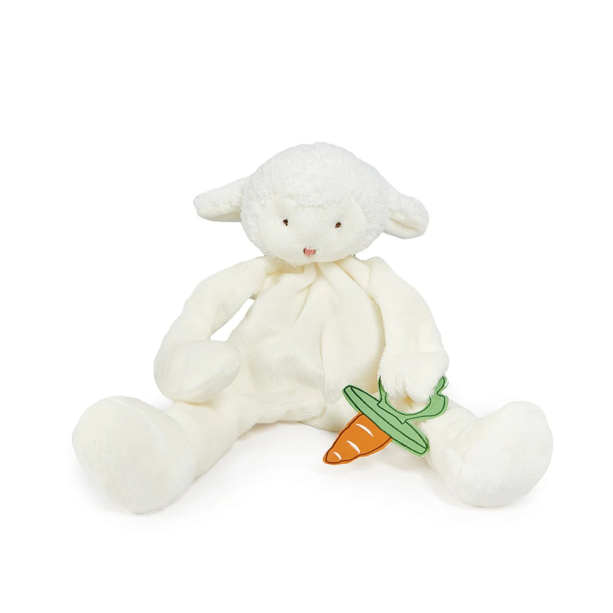 Super-soft and floppy, super silly, and oh so useful, this take -a-long pal will tie onto baby's stroller, crib or car seat. With pacifier holder hand loop and fun rattling head, this is sure to be a favorite security item of Baby and Mom and Dad alike! Signature three carrot tag for little one's fingers. Size: 10".